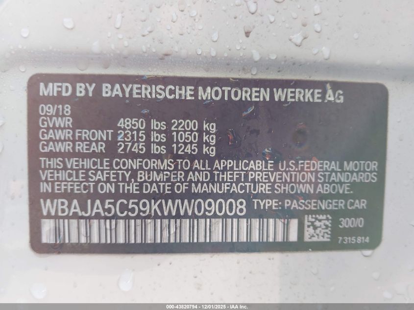 2019 BMW 5 SERIES 2019 року Бензин, 2.0, Задний привод, vin - WBAJA5C59KWW09008 из США