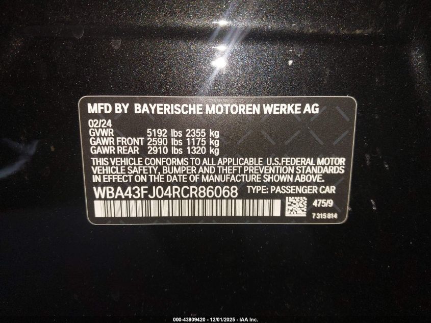 2024 BMW 5 SERIES 2024 року Бензин, 2.0, Задний привод, vin - WBA43FJ04RCR86068 из США
