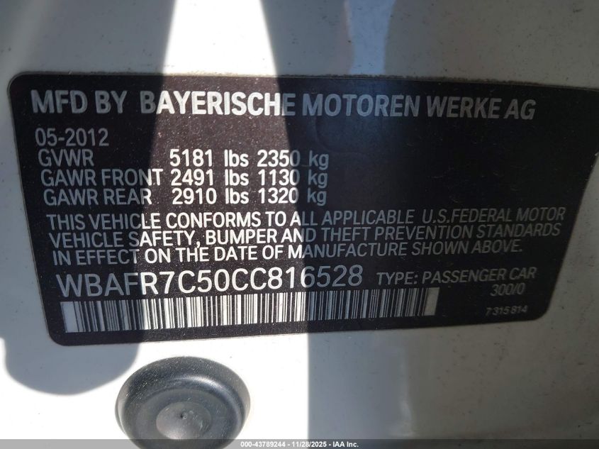 2012 BMW 5 SERIES 2012 року Бензин, 3.0, Задний привод, vin - WBAFR7C50CC816528 из США