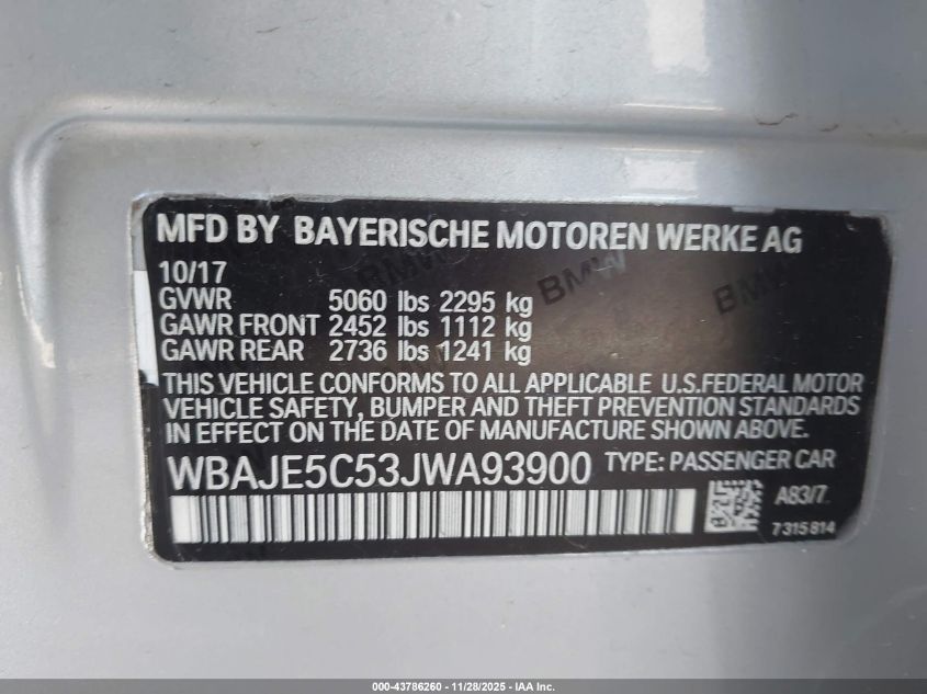 2018 BMW 5 SERIES 2018 року Бензин, 3.0, Задний привод, vin - WBAJE5C53JWA93900 из США