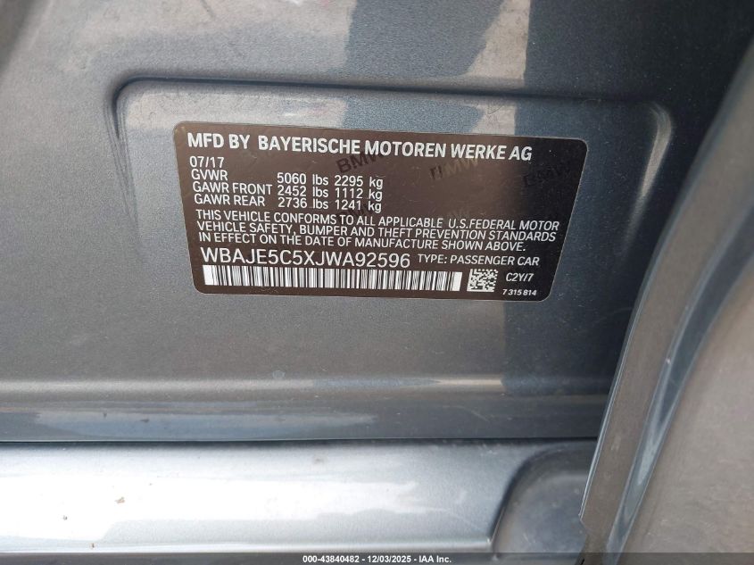 2018 BMW 5 SERIES 2018 року Бензин, 3.0, Задний привод, vin - WBAJE5C5XJWA92596 из США
