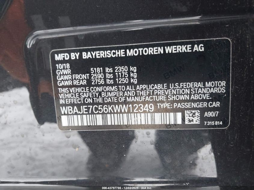 2019 BMW 5 SERIES 2019 року Бензин, 3.0, Полный привод, vin - WBAJE7C56KWW12349 из США