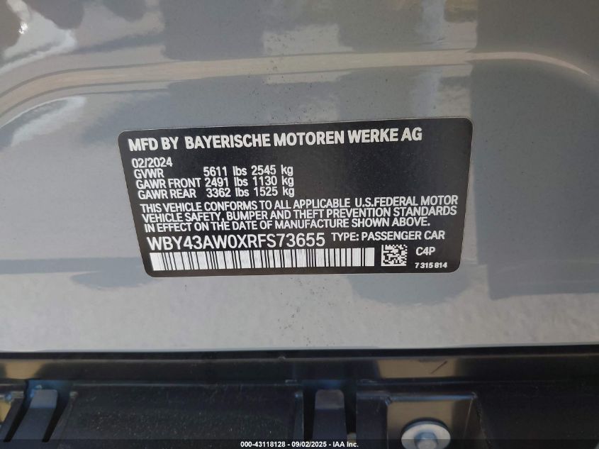 2024 BMW I4 2024 року Электрический, U, Задний привод, vin - WBY43AW0XRFS73655 из США
