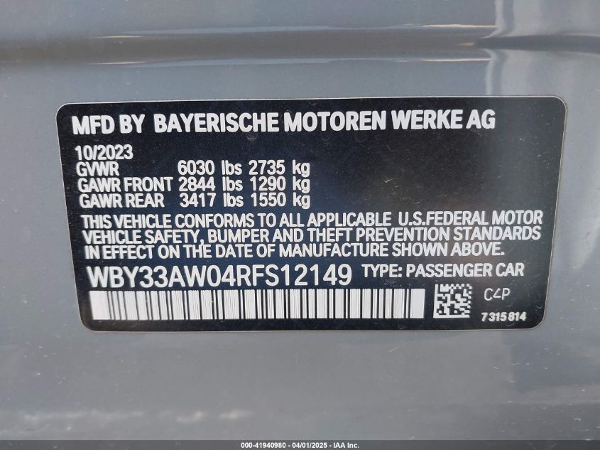 2024 BMW I4 2024 року Электрический, U, Полный привод, vin - WBY33AW04RFS12149 из США