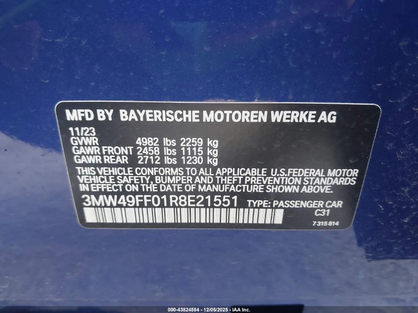 2024 BMW M3 2024 року Бензин, 3.0, Полный привод, vin - 3MW49FF01R8E21551 из США
