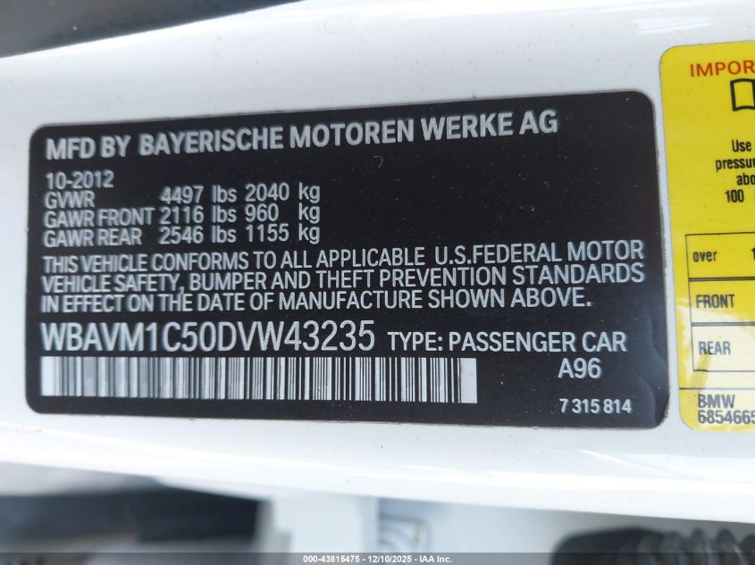 Цвет БелыйЦилиндры 4VIN WBAVM1C50DVW43235Состояние ЗаводитсяПовреждения Правая сторона AutoRIA