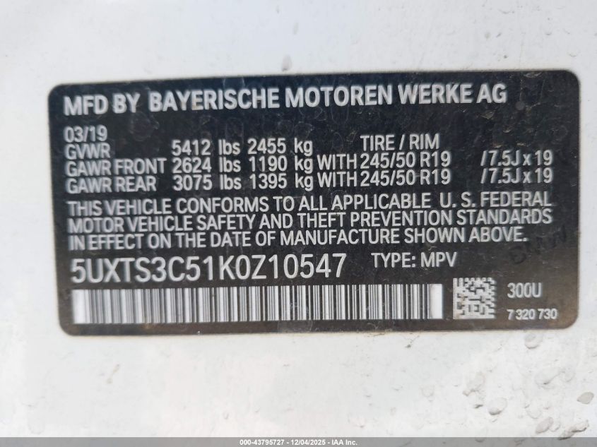 2019 BMW X3 2019 року Бензин, 3.0, Полный привод, vin - 5UXTS3C51K0Z10547 из США