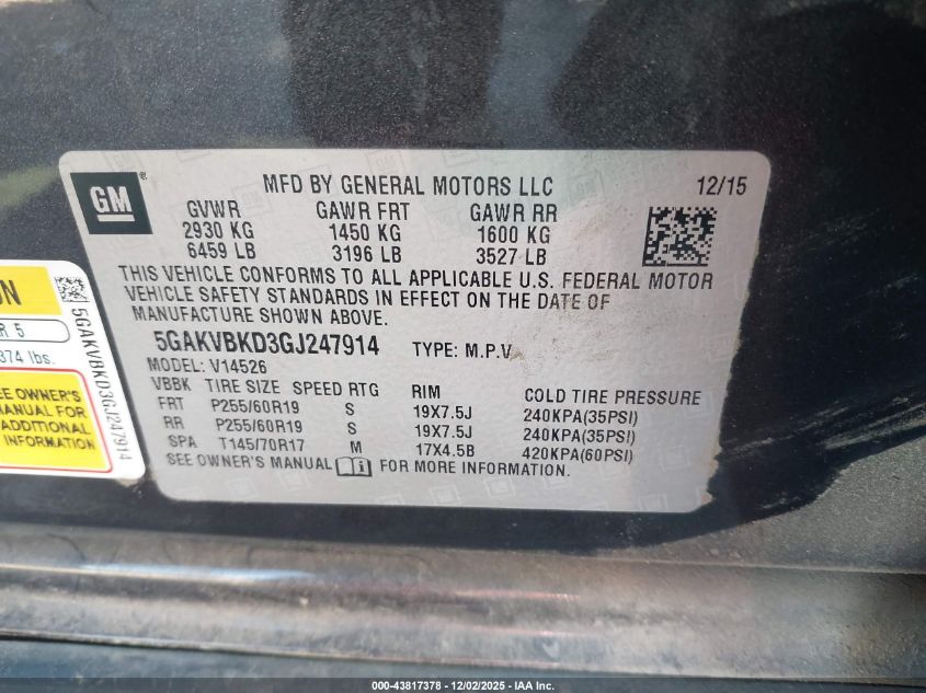 Цвет СерыйЦилиндры 6Привод Полный приводVIN 5GAKVBKD3GJ247914Состояние Заводится и едет (проверено)Повреждения Передняя или задняя AutoRIA