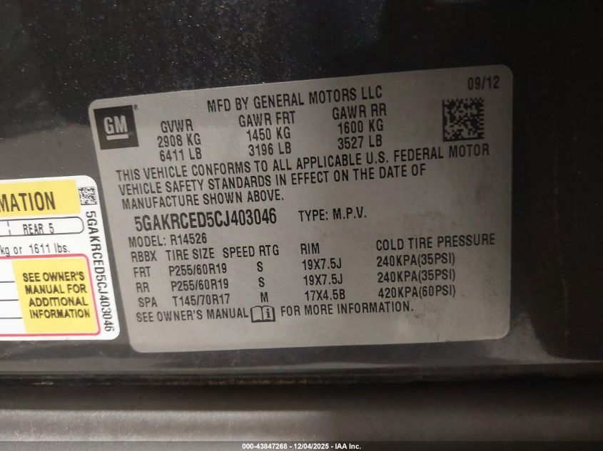 Цвет СерыйЦилиндры 6Привод Передний приводVIN 5GAKRCED5CJ403046Состояние СтационарноПовреждения Правая сторона AutoRIA