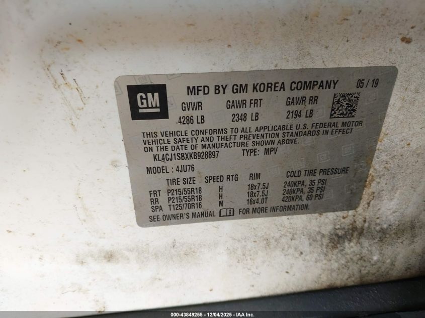Цвет БелыйЦилиндры 4Привод Передний приводVIN KL4CJ1SBXKB928897Состояние СтационарноПовреждения Передняя правая AutoRIA