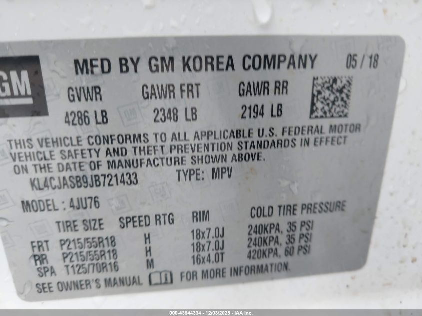 Цвет БелыйЦилиндры 4Привод Передний приводVIN KL4CJASB9JB721433Состояние Заводится и едет (проверено)Повреждения Передняя или задняя AutoRIA