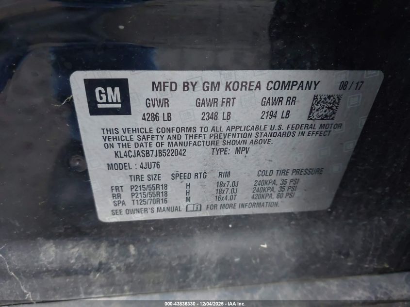 Цвет ЧерныйЦилиндры 4Привод Передний приводVIN KL4CJASB7JB522042Состояние СтационарноПовреждения Неизвестно AutoRIA