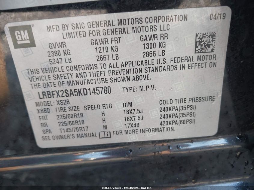 2019 BUICK ENVISION 2019 року Бензин, 2.5, Полный привод, vin - LRBFX2SA5KD145780 из США