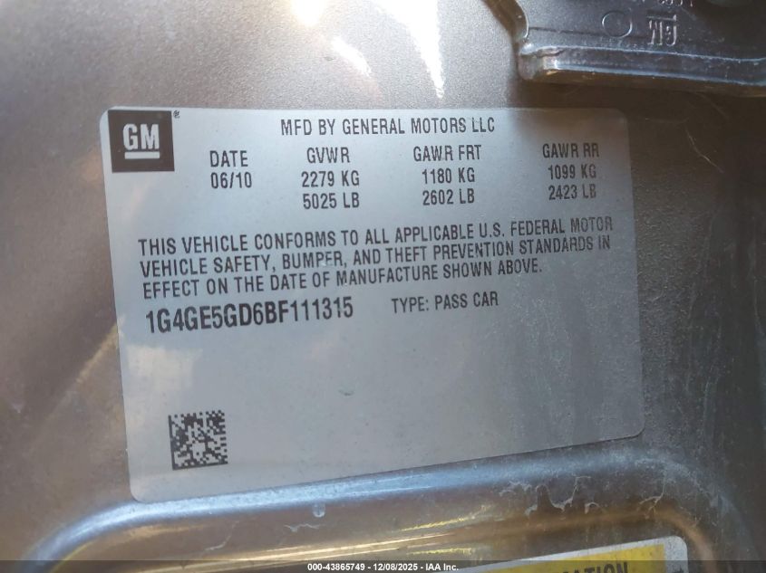 2011 BUICK LACROSSE 2011 року Бензин, 3.6, Передний привод, vin - 1G4GE5GD6BF111315 из США
