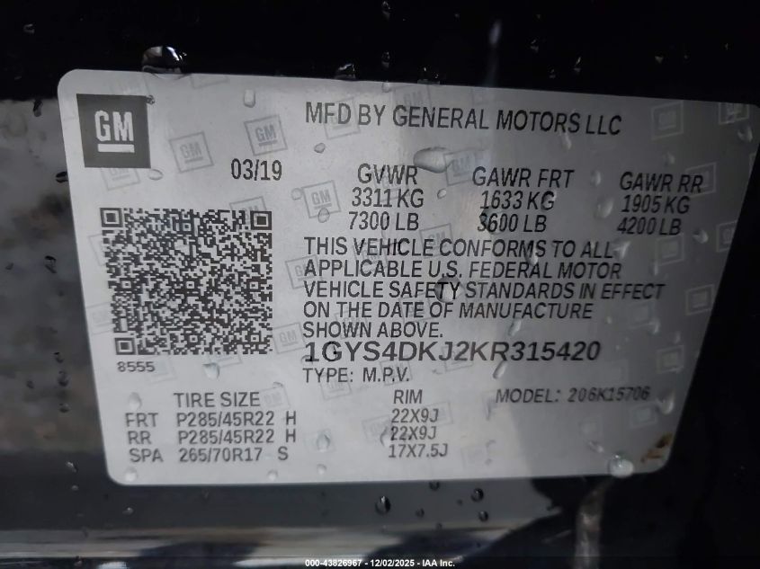 2019 CADILLAC ESCALADE 2019 року Бензин, 6.2, Полный привод, vin - 1GYS4DKJ2KR315420 из США