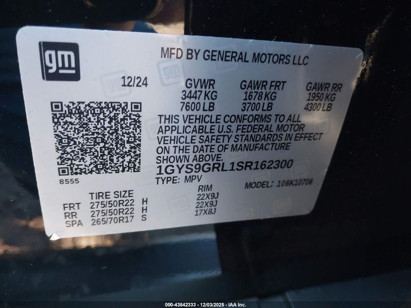 2025 CADILLAC ESCALADE 2025 року Бензин, 6.2, Полный привод, vin - 1GYS9GRL1SR162300 из США