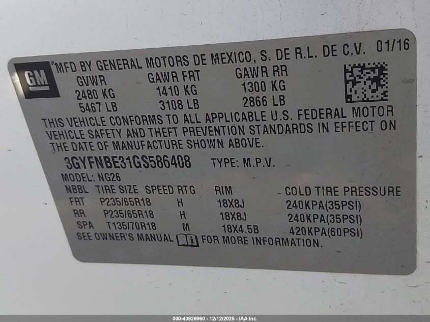 Цвет БелыйЦилиндры 6Привод Передний приводVIN 3GYFNBE31GS586408Состояние Заводится и едет (проверено)Повреждения Передняя правая