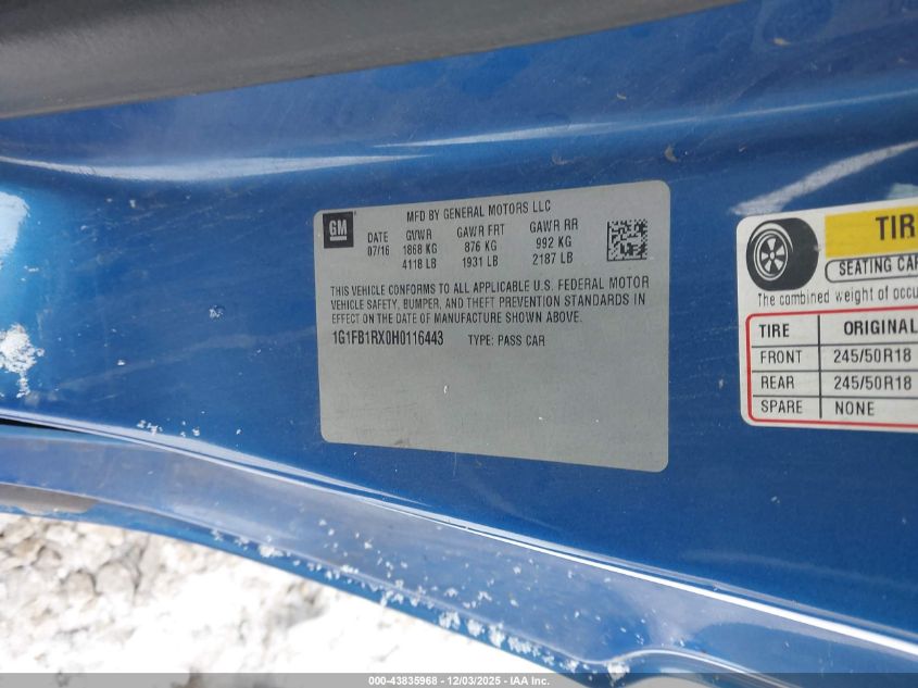2017 CHEVROLET CAMARO 2017 року Бензин, 2.0, Задний привод, vin - 1G1FB1RX0H0116443 из США