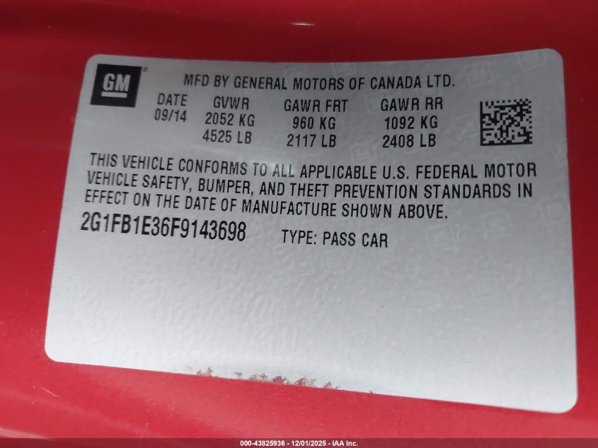 Цвет КрасныйЦилиндры 6Привод Задний приводVIN 2G1FB1E36F9143698Состояние ЗаводитсяПовреждения Передняя правая AutoRIA