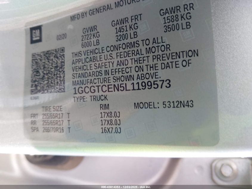 2020 CHEVROLET COLORADO 2020 року Бензин, 3.6, Полный привод, vin - 1GCGTCEN5L1199573 из США