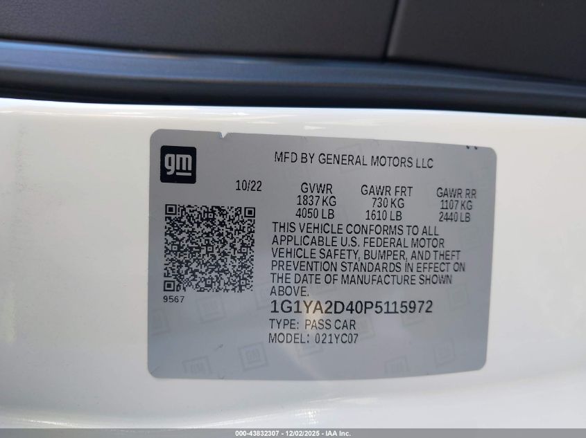 2023 CHEVROLET CORVETTE 2023 року Бензин, 6.2, Задний привод, vin - 1G1YA2D40P5115972 из США