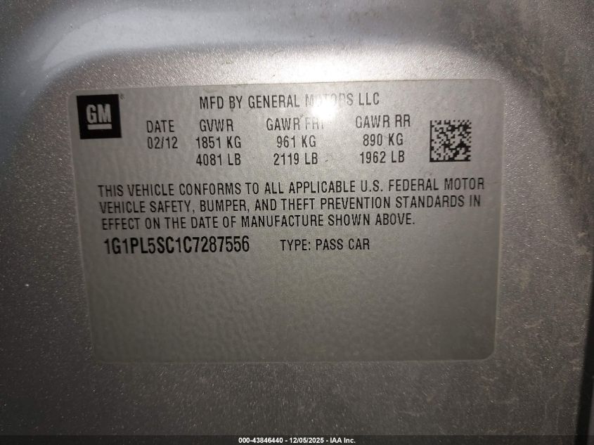 2012 CHEVROLET CRUZE 2012 року Бензин, 1.4, Передний привод, vin - 1G1PL5SC1C7287556 из США