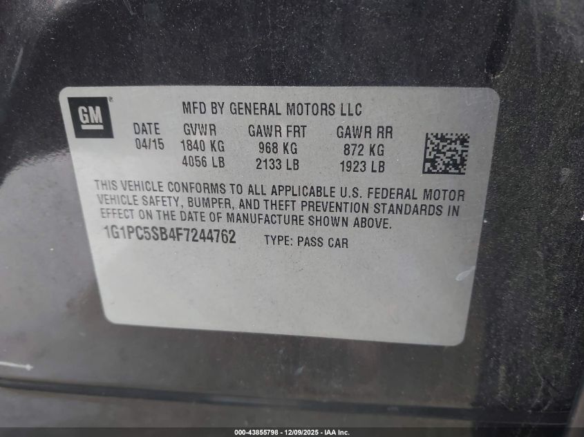 Цвет СерыйЦилиндры 4Привод Передний приводVIN 1G1PC5SB4F7244762Состояние СтационарноПовреждения Передняя или задняя AutoRIA