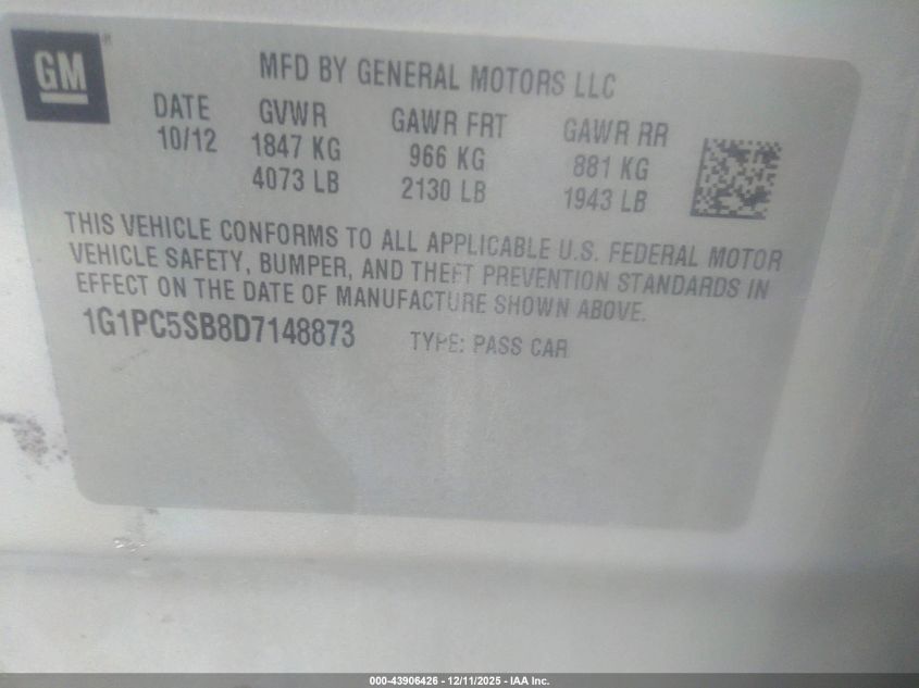 2013 CHEVROLET CRUZE 2013 року Бензин, 1.4, Передний привод, vin - 1G1PC5SB8D7148873 из США
