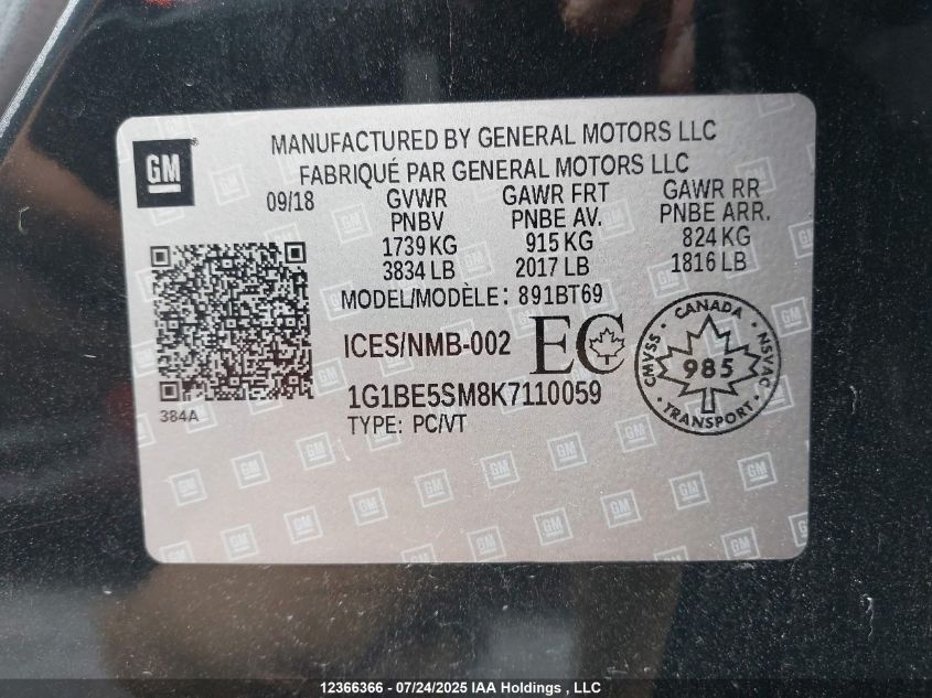 2019 CHEVROLET CRUZE 2019 року Бензин, , Передний привод, vin - 1G1BE5SM8K7110059 из США