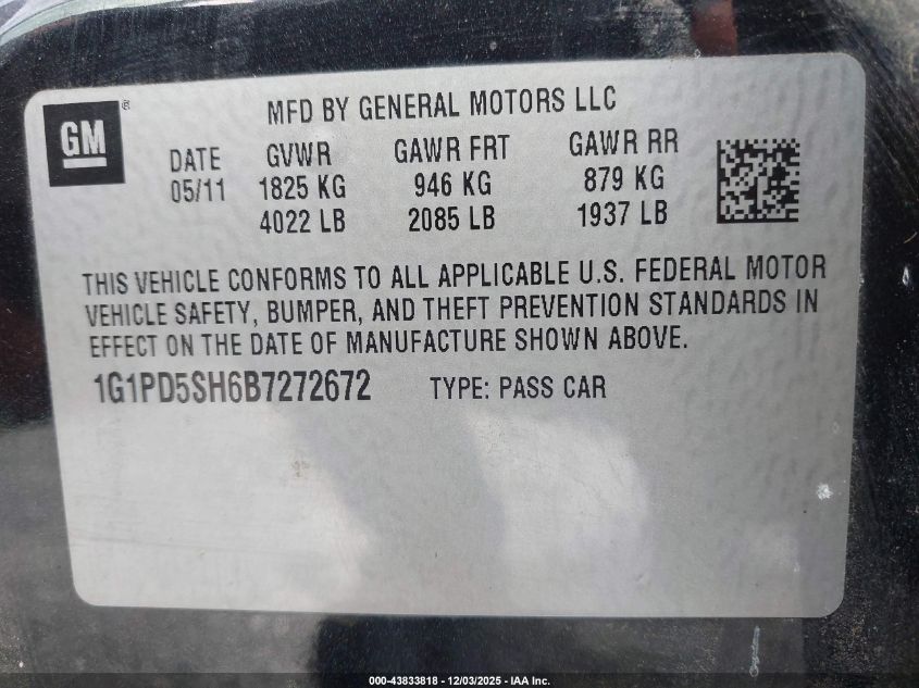 2011 CHEVROLET CRUZE 2011 року Бензин, 1.8, Передний привод, vin - 1G1PD5SH6B7272672 из США