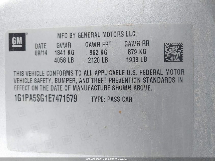 2014 CHEVROLET CRUZE 2014 року Бензин, 1.8, Передний привод, vin - 1G1PA5SG1E7471679 из США