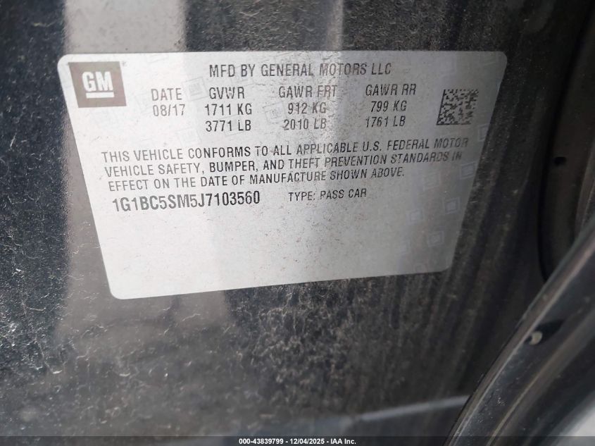 2018 CHEVROLET CRUZE 2018 року Бензин, 1.4, Передний привод, vin - 1G1BC5SM5J7103560 из США