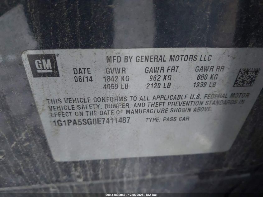 2014 CHEVROLET CRUZE 2014 року Бензин, 1.8, Передний привод, vin - 1G1PA5SG0E7411487 из США