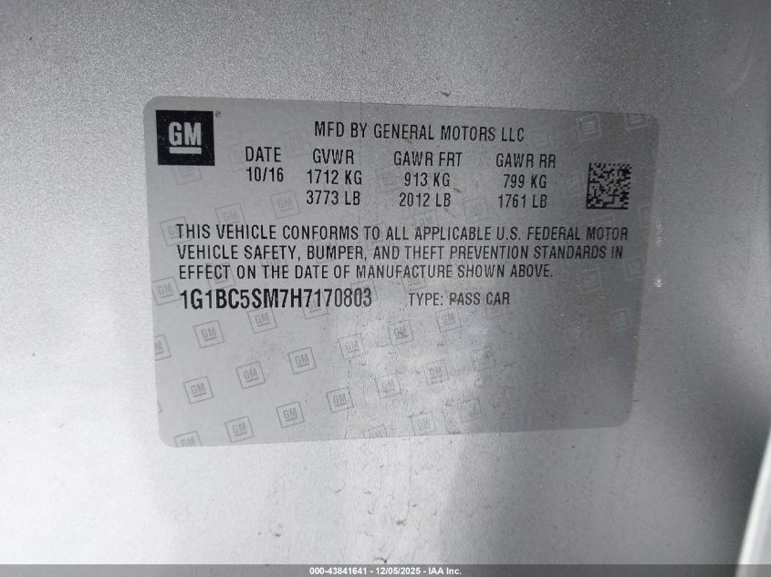 2017 CHEVROLET CRUZE 2017 року Бензин, 1.4, Передний привод, vin - 1G1BC5SM7H7170803 из США