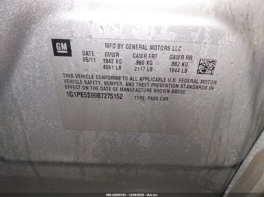 2011 CHEVROLET CRUZE 2011 року Бензин, 1.4, Передний привод, vin - 1G1PE5S99B7275152 из США