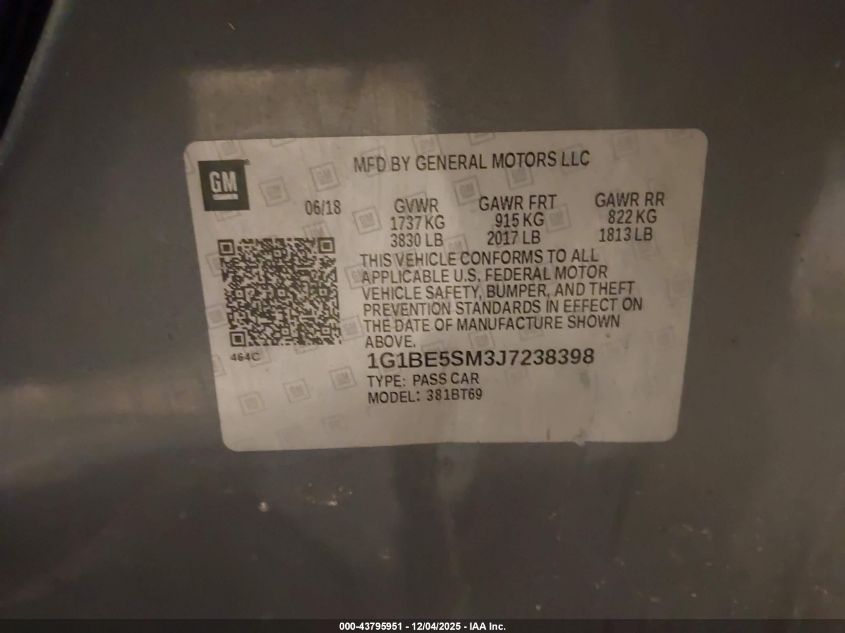Цвет СерыйЦилиндры 4Привод Передний приводVIN 1G1BE5SM3J7238398Состояние Заводится и едет (проверено)Повреждения Передняя или задняя AutoRIA