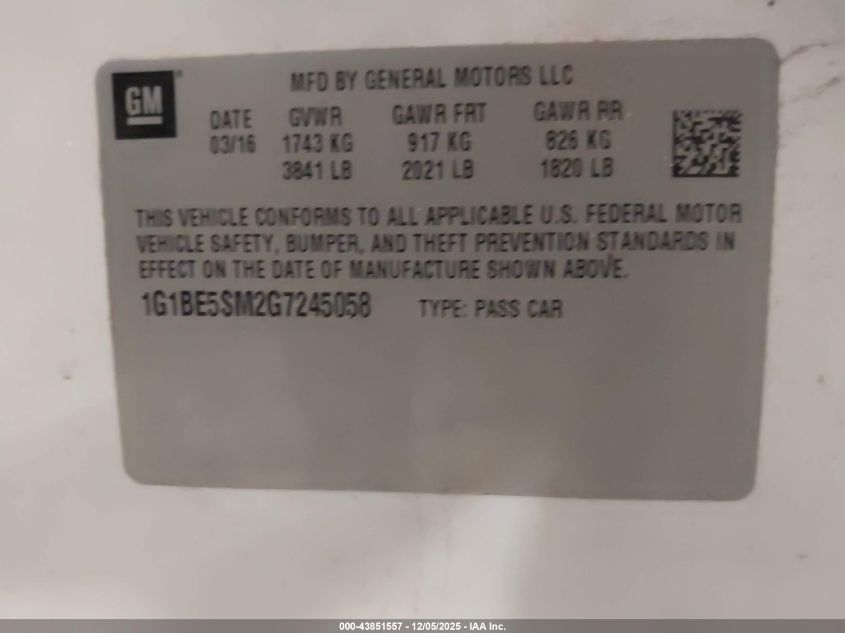 2016 CHEVROLET CRUZE 2016 року Бензин, 1.4, Передний привод, vin - 1G1BE5SM2G7245058 из США