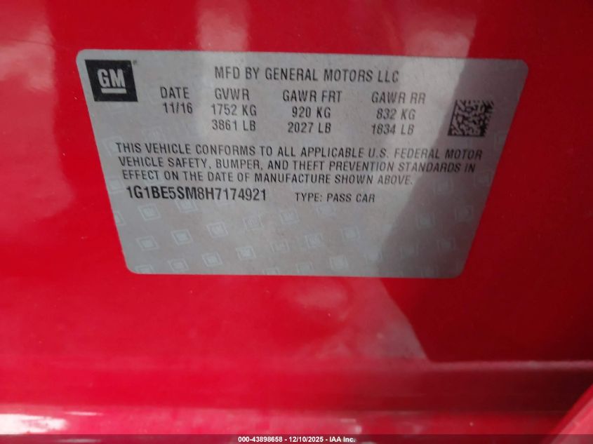 Цвет КрасныйЦилиндры 4Привод Передний приводVIN 1G1BE5SM8H7174921Состояние Заводится и едет (проверено)Повреждения Передняя или задняя AutoRIA