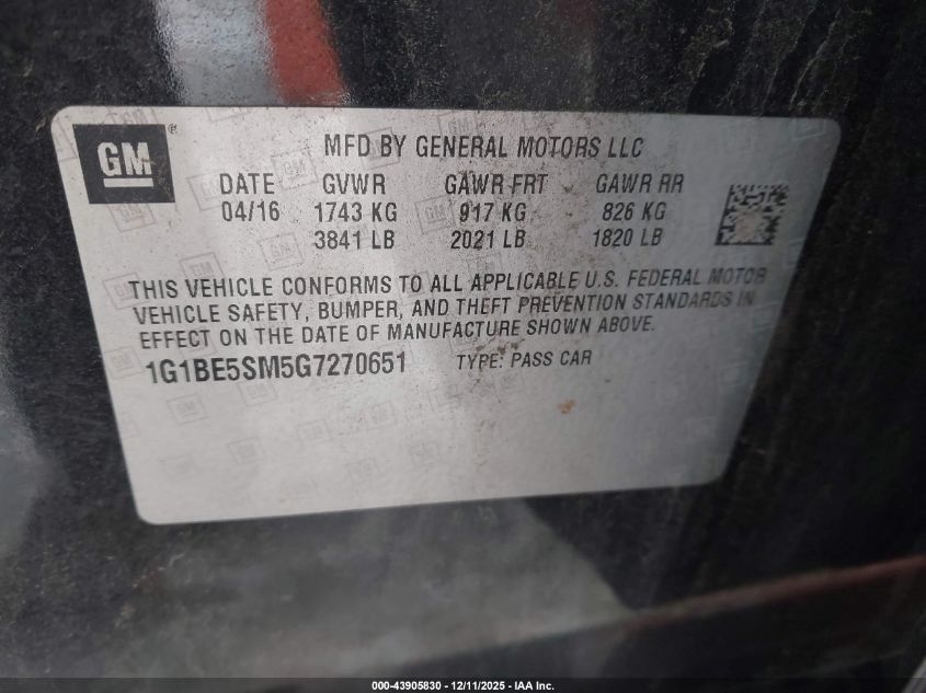 2016 CHEVROLET CRUZE 2016 року Бензин, 1.4, Передний привод, vin - 1G1BE5SM5G7270651 из США