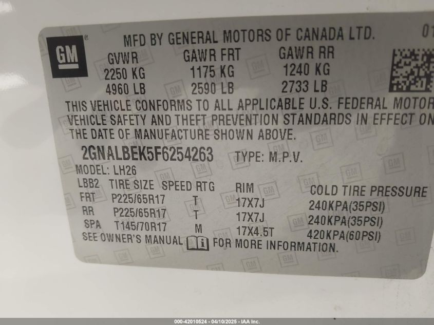 Цвет БелыйЦилиндры 4Привод Передний приводVIN 2GNALBEK5F6254263Состояние СтационарноПовреждения Передняя и задняяДата аукциона 2025-12-11 AutoRIA