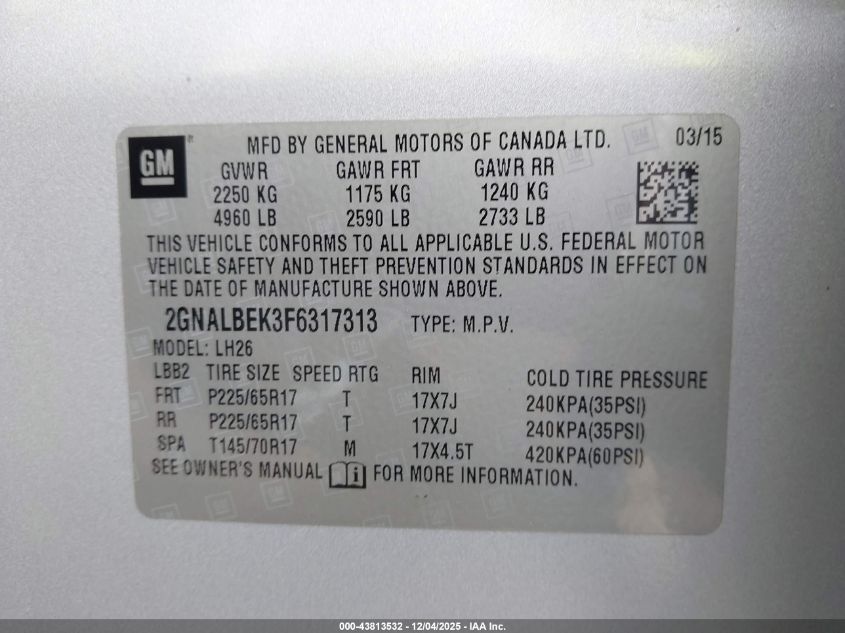 2015 CHEVROLET EQUINOX 2015 року Бензин, 2.4, Передний привод, vin - 2GNALBEK3F6317313 из США