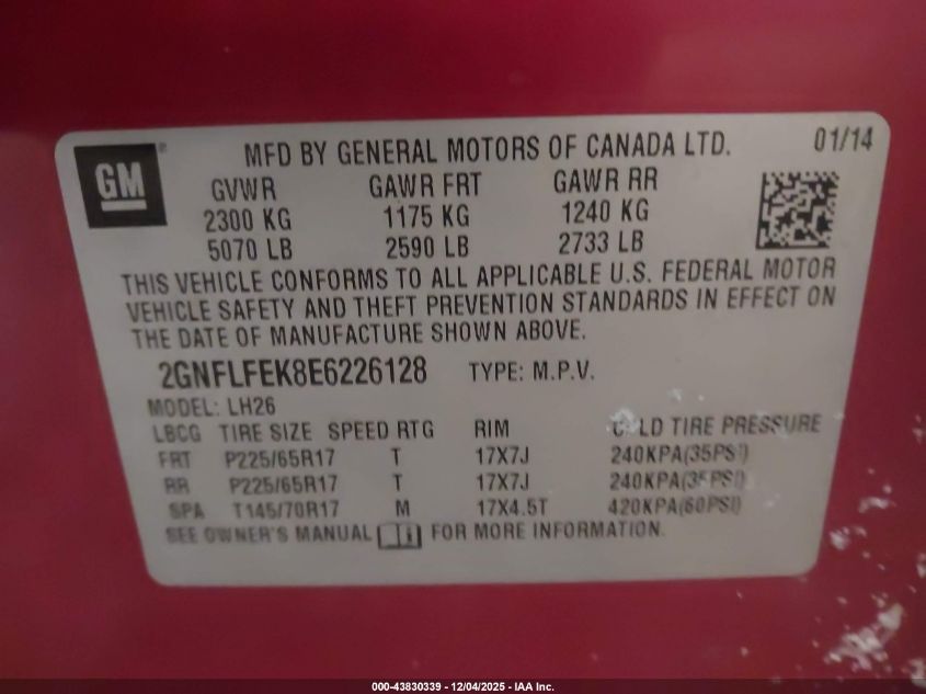 Цвет КрасныйЦилиндры 4Привод Полный приводVIN 2GNFLFEK8E6226128Состояние Заводится и едет (проверено)Повреждения Левая сторона AutoRIA