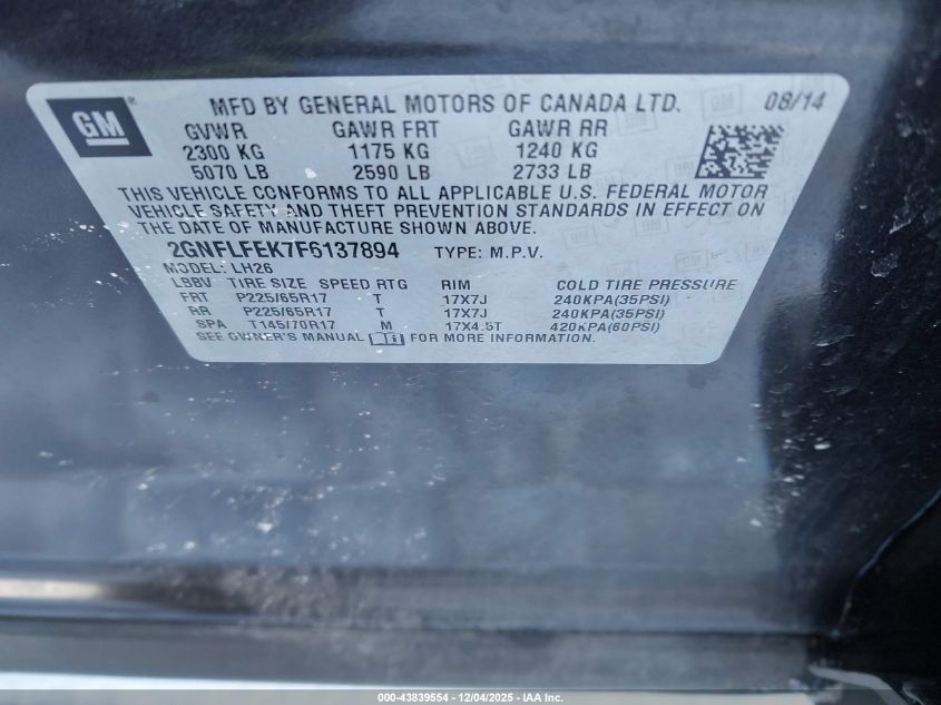 2015 CHEVROLET EQUINOX 2015 року Бензин, 2.4, Полный привод, vin - 2GNFLFEK7F6137894 из США
