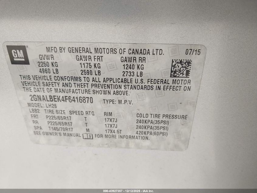 2015 CHEVROLET EQUINOX 2015 року Бензин, 2.4, Передний привод, vin - 2GNALBEK4F6416870 из США