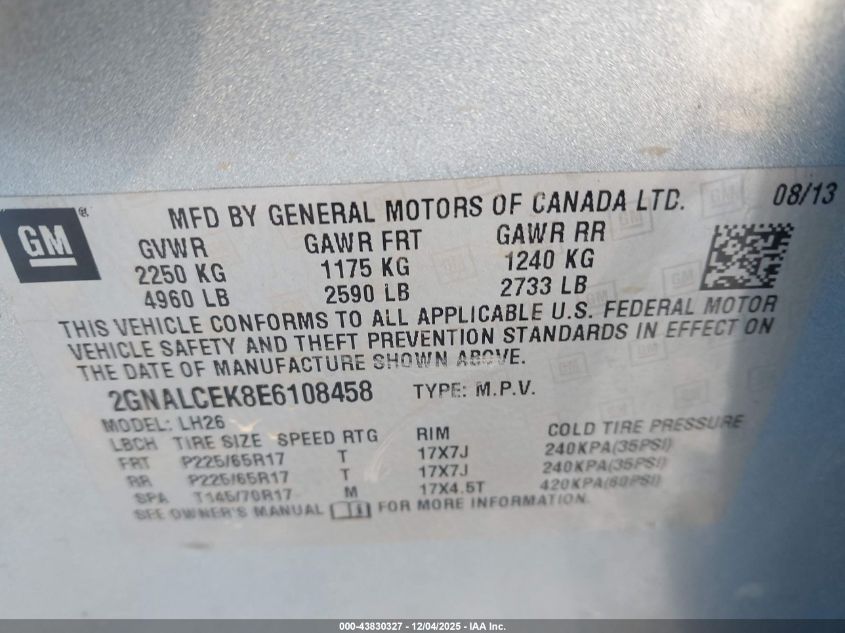 Цвет СерыйЦилиндры 4Привод Передний приводVIN 2GNALCEK8E6108458Состояние Заводится и едет (проверено)Повреждения Передняя или задняя AutoRIA