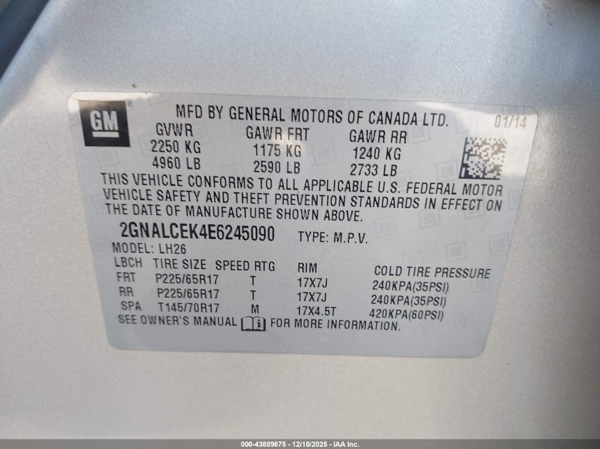 2014 CHEVROLET EQUINOX 2014 року Бензин, 2.4, Передний привод, vin - 2GNALCEK4E6245090 из США