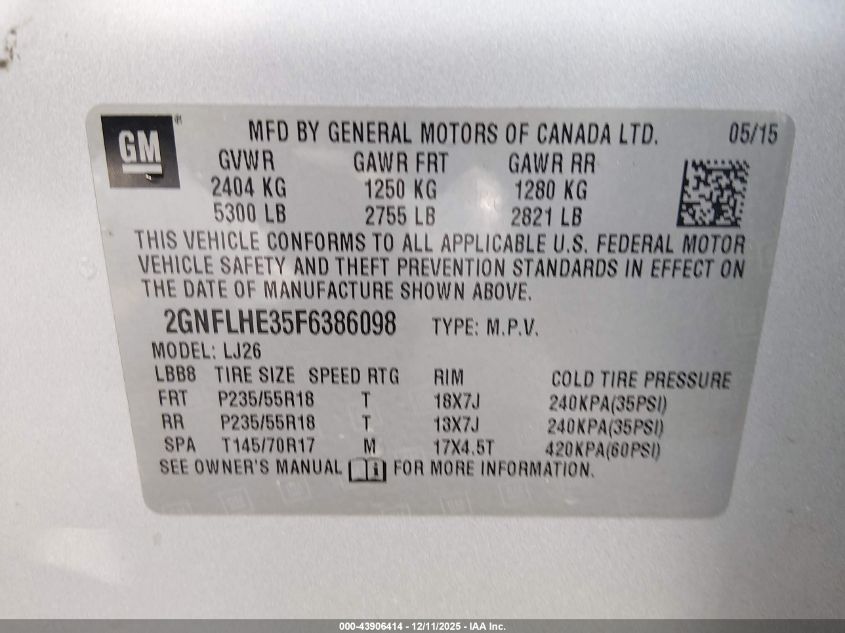 2015 CHEVROLET EQUINOX 2015 року Бензин, 3.6, Полный привод, vin - 2GNFLHE35F6386098 из США