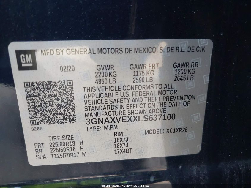 2020 CHEVROLET EQUINOX 2020 року Бензин, 2.0, Полный привод, vin - 3GNAXVEXXLS637100 из США