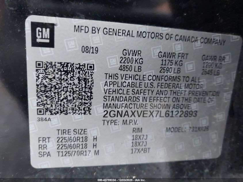2020 CHEVROLET EQUINOX 2020 року Бензин, 2.0, Полный привод, vin - 2GNAXVEX7L6122893 из США