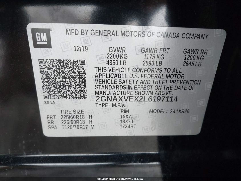 2020 CHEVROLET EQUINOX 2020 року Бензин, 2.0, Полный привод, vin - 2GNAXVEX2L6197114 из США